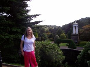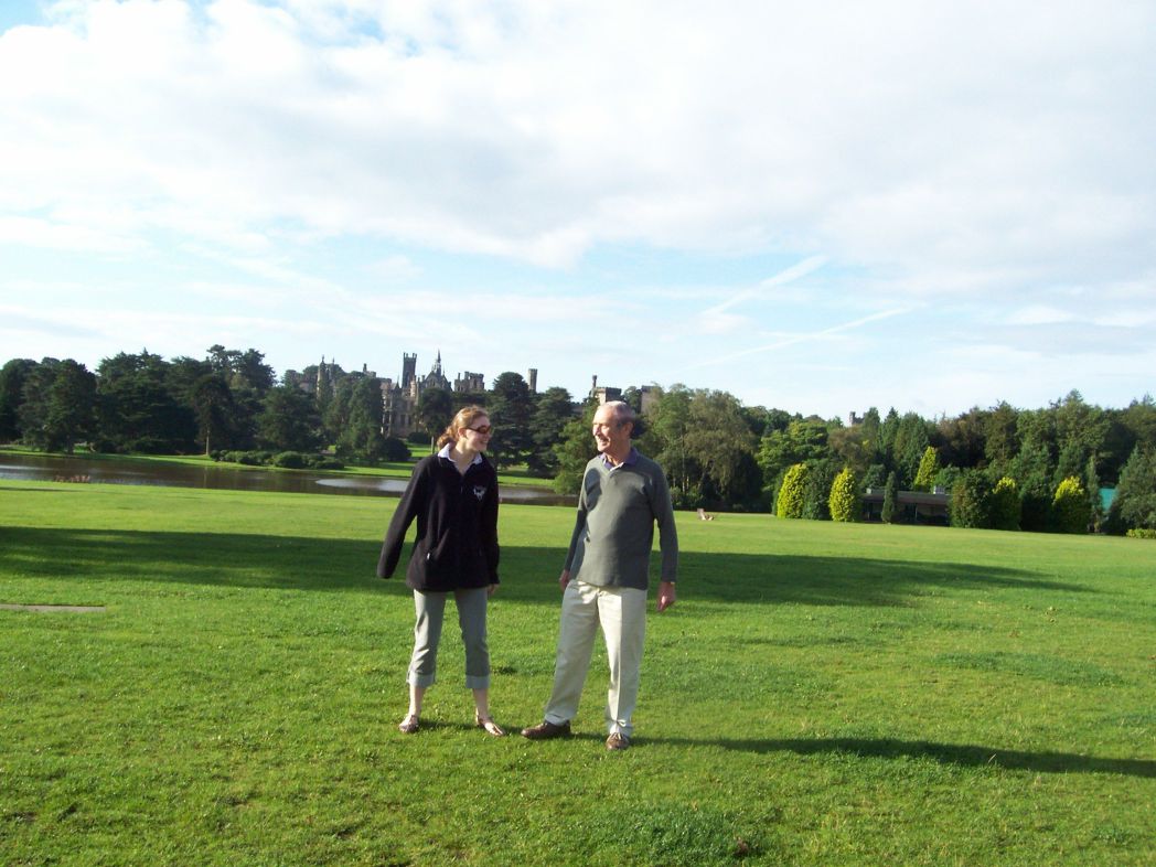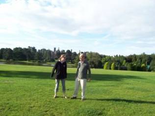 Teresa pauses in front of the gardens and the temple Roger and Jay joke on the grass – the old buildings in the background