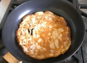 steady stream of light, piping hot, pancakes, tossed high from the pan, until