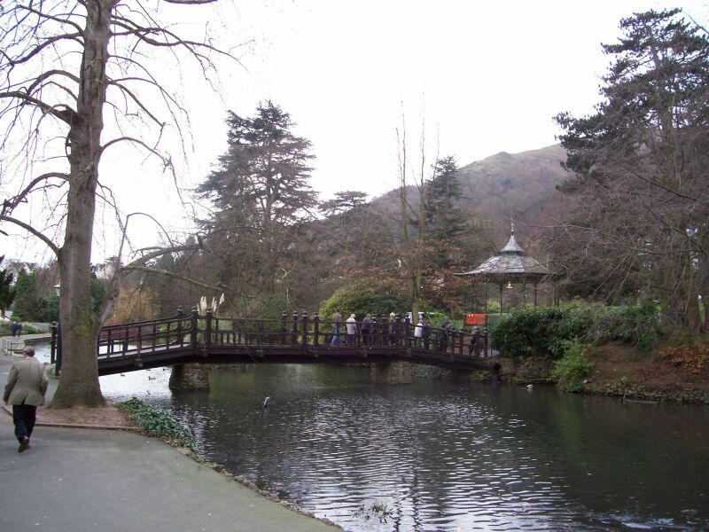 the theatre from the car park via the ornamental pool and footbridge; starting