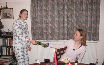 Thereafter, Christmas took its more usual form, with meals and presents carefully chosen by Teresa, who had recovered just about in time, and there were only a few little hitches caused principally by the bad weather. We started on Christmas Eve with mulled wine and nibbles, followed by a meal of beef for Roger and Teresa and duck for the girls. However, as we were unable to get to Marks and Spencer to collect the prime fillet beef ordered, we had to forgo the Wellington and have a piece of topside from Tesco. More wine, chocolates and coffee followed and we tried the first of our new family games for Christmas. Christmas day lunch was as good as ever – preceded by a sparkling rosé to toast Christmas in, then on to the turkey and trimmings with a fine Rioja to wash it down. We repaired to the sitting room for a multitude of presents as ever, both intriguing and practical, though the emphasis may have been on things to wear and things to eat – Roger, for example, had a pair of bootee-type slippers which seem to have overcome the cold feet problem he had been getting, a cornucopia of his favourite chocolate and sweets and some well chosen books. We also had some more new games and quizzes to try as well as some old favourites to return to.