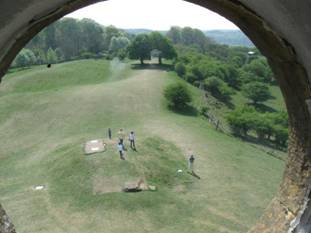 Looking out from the tower – Roger didn’t go to the top and can be seen standing below to the right of the mound ► |