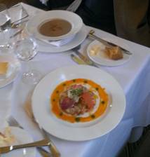(soup and sea-food for Roger and Teresa respectively), the same beef main