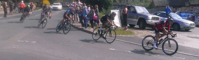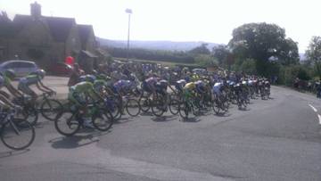 breakaway group takes the roundabout … followed by the peleton, heading down the