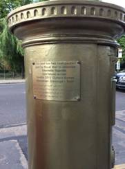 gold post-box commemorating the Olympic Gold won in 2012 by Charlotte Dujardin